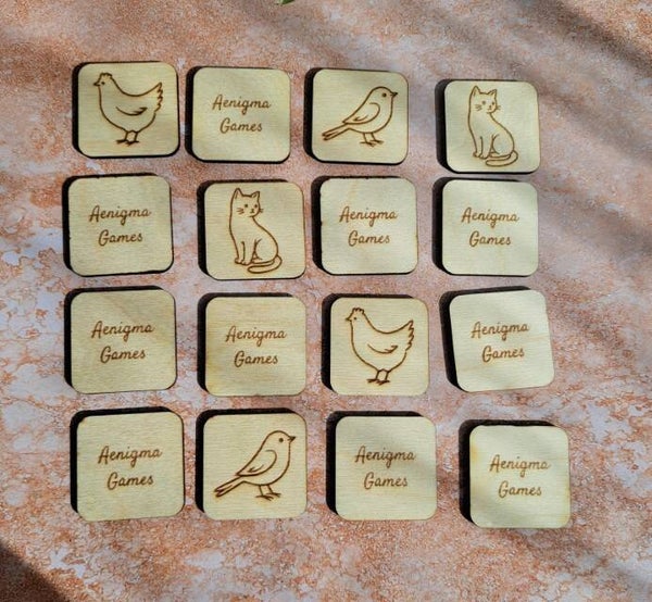 - Dimensions environ 4 cm (bords arrondis) : 16 cartes : 8 paires d'animaux